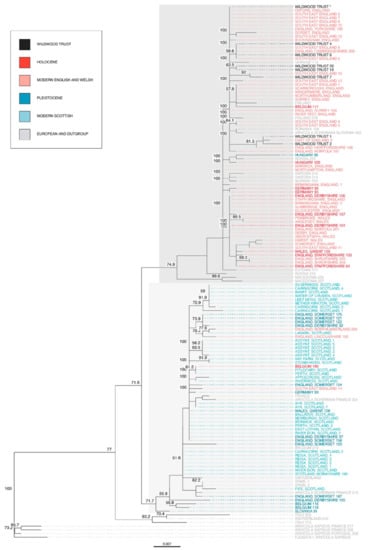 - Filipi, K.; Marková, S.; Searle, J.B.; Kotlík, P. Mitogenomic phylogenetics of the bank vole Clethrionomys glareolus, a model system for studying end-glacial colonization of Europe. Mol. Phylogenet. Evol. 2015, 82, 245–257. [Google Scholar] [CrossRef]