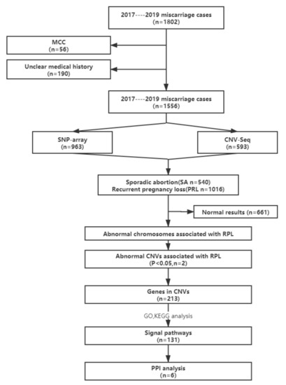 Flow diagram of the cases of miscarriage included, and the analytical strategies used in the present study. MCC, maternal cell contamination; SNP-array, single nucleotide polymorphism array; CNV-seq, copy number variation sequencing; RPL, recurrent pregnancy loss; PPI analysis, protein-protein interaction analysis.
