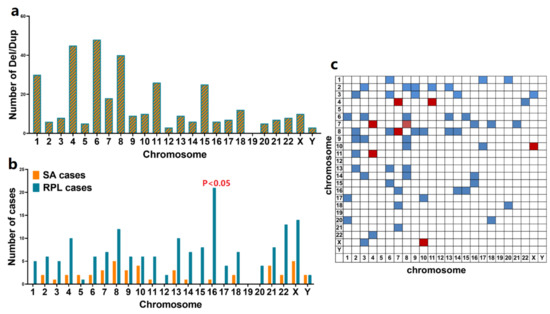 As a complex polygenic and multifactorial disease, there are multiple etiologies underlying RPL, but 50% of cases can be attributed to genetics, such as aneuploidy. Additionally, a spectrum of non-genetic etiologies of RPL have also been identified, including maternal thrombophilic disorders, uterine abnormalities, sperm DNA fragmentation, immune and endocrine disturbances, and even lifestyle factors such as drinking and smoking [5,6]. Numerous studies have been performed to determine potentially genetic markers associated with pregnancy loss, more recently taking advantage of high-resolution molecular techniques, including chromosomal microarray analysis and next-generation sequencing. However, the results vary from study to study. Although large copy-number variations (CNVs) are well known to be associated with the risk of miscarriage [7], specific information based on large and systematic cohorts regarding the relationship between specific CNVs and RPL is limited. Moreover, it is unclear whether there exists a distinction of CNVs between cases of SA and cases of RPL.