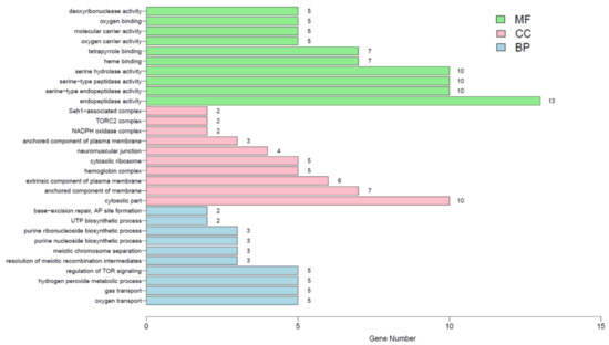 The top 10 enriched pathway results in three categories with p < 0.05 of Gene Ontology analysis. MF, Molecular Function; CC, Cellular Component; BP, Biological Process.