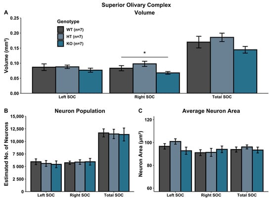 Histological assessment in SOC. (A) Volumetric analysis of left, right and total (left + right) SOC. Heterozygous Ush2a mutations increased the volume of the right SOC while homozygous Ush2a mutations reduced the volume of the right SOC. (B,C) There were no significant genotype differences in neuron population (B) or average neuron area (C). * p < 0.05.