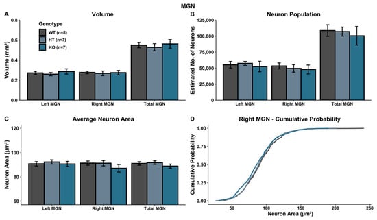 There was no significant Genotype effect on neuron population within the MGN (left MGN: F(2, 19) = 0.174, p > 0.05; right MGN: F(2, 19) = 0.174, p > 0.05; total MGN: F(2, 19) = 0.168, p > 0.05) (Figure 3B), nor for average neuron size (area) within the MGN (left MGN: F(2, 19) = 0.219, p > 0.05; right MGN: F(2, 19) = 1.039, p > 0.05; total MGN: F(2, 19) = 0.965, p > 0.05) (Figure 3C). Additionally, in the left MGN, no significant K–S statistics for the cumulative distribution of cell size were seen (left MGN (WT vs. HT): p > 0.05; left MGN (WT vs. KO): p > 0.05; left MGN (HT vs. KO): p > 0.05). However, within the right MGN, WT and KO subjects were significantly different (right MGN (WT vs. KO): p < 0.05), with a shift towards more smaller neurons in KO subjects. WT vs. HT subjects did not yield a significant K–S statistic (right MGN (WT vs. HT): p > 0.05), nor did HT vs. KO subjects (right MGN (HT vs. KO): p > 0.05) (Figure 3D). No effects were seen for the overall MGN (total MGN (WT vs. HT): p > 0.05; total MGN (WT vs. KO): p > 0.05; total MGN (HT vs. KO): p > 0.05).