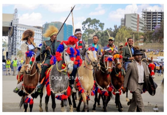 Likewise, horses played significant roles in the course of Ethiopian civilizations. For instance, a characteristic feature of the traditional Ethiopian social scene was the custom of calling chiefs, warriors and other persons of status after the names of the horses they rode [10]. Such traditional calling was introduced by Oromo tribe who used horses in great battles [10]. Horses made a marked shift in the course of Ethiopian history during the European colonization of Africa where Ethiopian horsemen and patriots defeated a well-armed European power at the battle of Adwa on 2 March 1896 as recently demonstrated in the parade organized by the late prominent Oromo singer Hachalu Hundessa at Meskel Square in Addis Ababa on 2 March 2019 (Figure 1). Today, horses and donkey are essential assets to agriculture and remain sole means of land transport systems in much of the rural communities in Ethiopia.