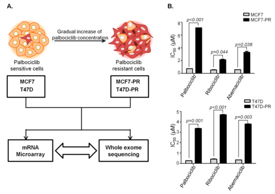 Schematic design of the current study. Generation of palbociclib-resistant cells. (A) Palbociclib-resistant HR-positive breast cancer cells, indicated as MCF7-PR and T47D-PR, were generated by gradually exposing MCF7 and T47D cells to increasing concentrations of palbociclib. (B) The IC50 of palbociclib in MCF7-PR and T47D-PR cells increased by around 10-fold. MCF7-PR and T47D-PR cells were cross-resistant to ribociclib and abemaciclib. P values were calculated by Student’s t-test. Data are presented as means ± standard deviation of triplicate experiments. Palbociclib-resistant cells and their sensitive counterparts were compared using microarray analyses and whole-exome sequencing.