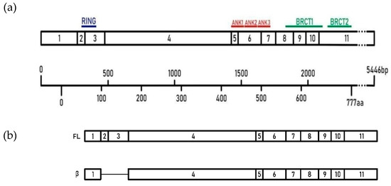 (a). Structure of BARD1. Exon structure, length, and domain composition of BARD1 FL (NCBI Reference Sequence: NM_000465.4, UniProtKB-Q99728). (b). Exon structure of full-length BARD1 and its beta isoform.