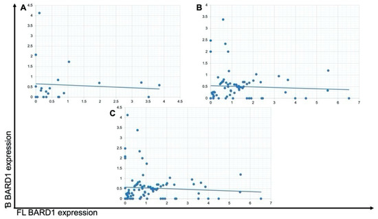 BARD1 FL and BARD1 β isoforms mRNA expression correlation. Neuroblastoma patients were divided into two groups based on the stage of the disease: (A) Connected stages 1 & 2 (n = 19), (B) Stage 3, 4 & 5 (n = 70) and (C) Patients’ data without stage division (n = 89).