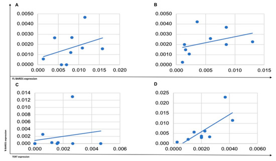 TERT, BARD1 FL, and β isoform mRNA expression correlation in yolk sac samples. (A) Correlation between BARD1 FL and β isoform in unchanged histological tissue. (B) Correlation between BARD1 FL and β isoform in tumor tissue. (C) Correlation between BARD1 β isoform and TERT in unchanged histological tissue. (D) Correlation between BARD1β isoform and TERT in tumor tissue.