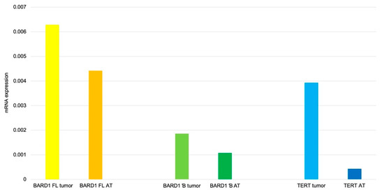 Lastly, we examined the expression of BARD1 (FL and β) in a small group of aggressive soft tissue sarcoma, RMS. The TP53, NF1, NRAS, CDK4, MYCN, GLI, MDM2, FGFR1, and FGFR4 are listed among the most frequently altered in these tumours, interestingly they play a role in the cell cycle regulation and DNA repair, and interact with BARD1 [55,56]. Also, chromosome 2 alterations (where BARD1 is located, 2q34-35) are commonly found in RMS [57]. Our research showed that BARD1β isoform and the TERT gene were significantly more strongly expressed in the neoplastic tissue compared to the healthy control tissue.