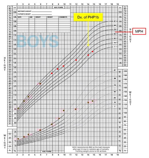 At the age of 14 years, the proband was again seen in the Genetics Clinic (Figure 1). He did not have a history of hypocalcemia or tetany. His height and weight were 153.7 cm (−1.3 SD, 10th percentile) and 56.7 kg (+0.5 SD, 70th percentile), respectively and he had normal body proportions without evidence of skeletal abnormalities. His midparental height was 178.6 cm (+0.2 SD, 60th percentile). His external genitalia were Tanner stage II, Neurologic examination was normal except for brisk deep tendon reflexes on his knees. His thyroid function was within normal ranges, while blood chemistry analysis revealed hypocalcemia and elevated PTH levels. Levels of serum magnesium, alkaline phosphatase, and 25-hydroxyvitamin D were normal. In addition to BWS, he was diagnosed with PHP1b was diagnosed. He was immediately treated with intravenous calcium replacement followed by oral calcium and vitamin D therapy. There was no evidence of nephrocalcinosis on abdominal ultrasound. He has since completed his high school education and is attending college at this time.