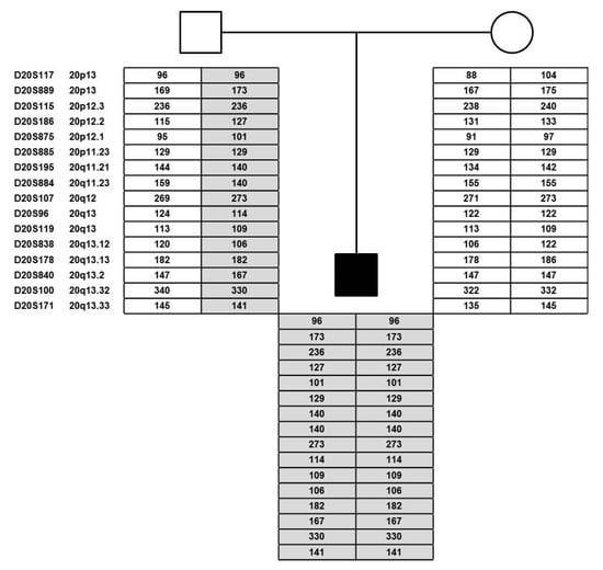 Polymorphic microsatellite marker analysis. Pedigree of the proband and his parents showing the results of the 16 polymorphic microsatellite markers distributed throughout the entire chromosome 20 (6 markers for chromosome 20p and 10 markers for chromosome 20q). This data confirms that the patient harbors isodisomy of the entire chromosome 20 originated from his father. Grey areas indicate the region of UPD and its parental origin.