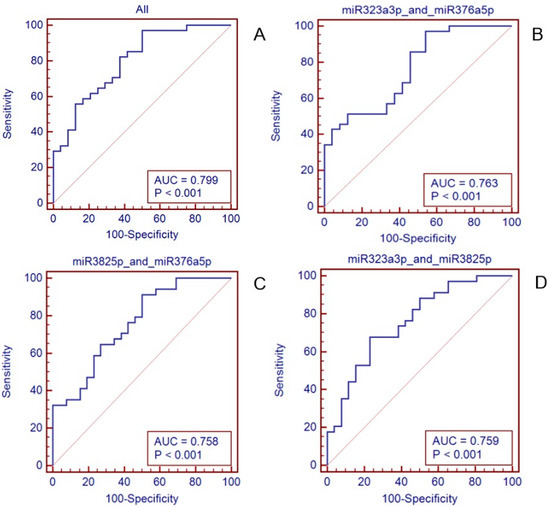 Predictive accuracy of the 3 miRNAs & 2 miRNAs to distinguish patients with LN metastasis from those without LN metastasis. (A) 3-microRNA signature (miR-323a-3p, miR-382-5p, miR-376a-3p). (B) 2-microRNA signature (miR-323a-3p, miR-376a-3p). (C) 2-microRNA signature (miR-323a-3p, miR-382-5p). (D) 2-microRNA signature (miR-382-5p, miR-376a-3p).