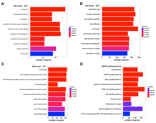 Top 10 GO and KEGG terms from the pathway enrichment analysis of the DEGs: (A) Biological process (BP); (B) molecular function (MF); (C) cellular component (CC); (D) KEGG pathway.