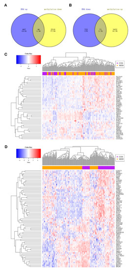 Identification of the hypo-up genes and hyper-down genes. Venn diagram of (A) the hypo-up genes and (B) the hyper-down genes. Heatmap of (C) the hypo-up genes and (D) the hyper-down genes between the MDD patients and healthy controls.
