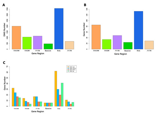 In a certain gene, DNA methylation occurs in different regions, including TSS1500, TSS200, 1stExon, gene body, 5′UTR, and 3′UTR, as well as other regions, the function of which remains unclear. Genomic annotation of the methylation based on the CpGs in different regions revealed a biased genomic distribution. As shown in Figure 6A, the maximum number of DMGs is was in the gene body region (>3000), followed by the TSS1500 region (>2000), while the 1stExon region had the minimum (<500). The DNA methylation distribution tendency of the overlap of the DEGs and DMGs was identical in that the gene body region had more than 100 DMGs ranking first, with the TSS1500 region coming second with more than 80, and the 1stExon region being last with at least 30 (Figure 6B). In terms of individual regions, the gene body had the highest percentage of DMGs. Unfortunately, little research on the DNA methylation in this region has been reported.
