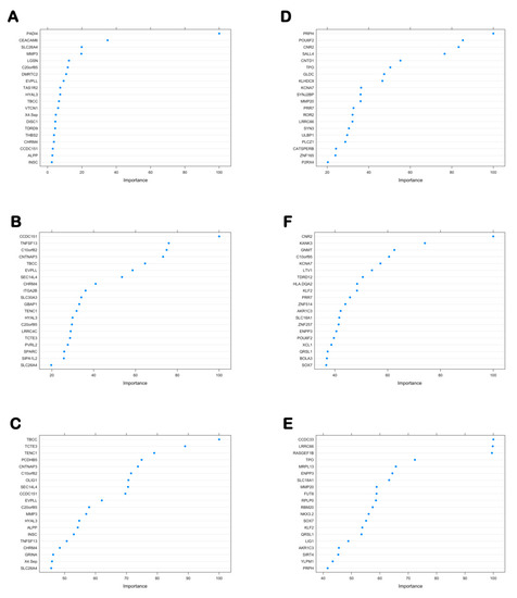 The “importance” function of the “randomForest” package was used to calculate the average importance of each gene in the six classifiers, and their importance was ranked in descending order. Figure 7A–F shows the importance scores of the top 20 genes in each classifier, and all of the genes and importance scores are listed in Table 3 and Table 4.