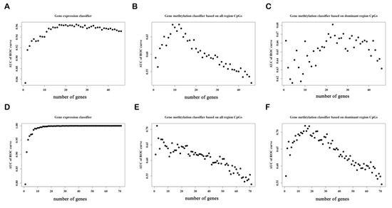 To obtain the best classification predictive power of each classifier, we added the candidate genes into each classifier one-by-one in order of importance. Figure 8A–C shows that the top 25, top 12, and top 23 are the best predictors of the hypo-up gene expression classifier, the gene methylation classifier based on the CpGs in all of the regions, that based on the CpGs in the dominant regions, respectively. Figure 8D–F shows that the top 31, top 2, and top 18 are the best predictors of the hyper-down gene expression classifier, the gene methylation classifier based on the CpGs in all of the regions, and that based on the CpGs in the dominant regions, respectively.