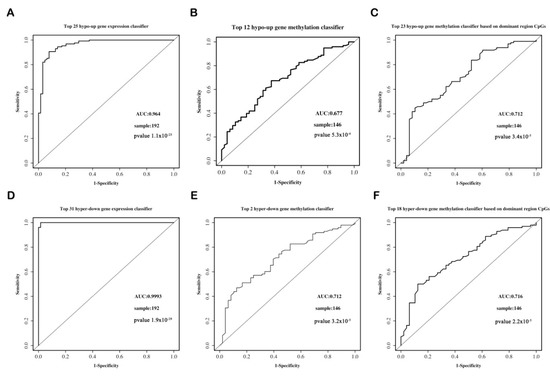 ROC curves for the hypo-up genes and hyper-down gene classifiers. (A) Top 25 hypo-up gene expression classifier. (B) Top 12 hypo-up gene methylation classifier based on the CpGs in all of the regions. (C) Top 23 hypo-up gene methylation classifier based on the CpGs in the dominant regions. (D) Top 31 hyper-down gene expression classifier. (E) Top 2 hyper-down gene methylation classifier based on the CpGs in all of the regions. (F) Top 18 hyper-down gene methylation classifier based on the CpGs in the dominant regions. ROC, receiver operating characteristic; AUC, area under the curve.