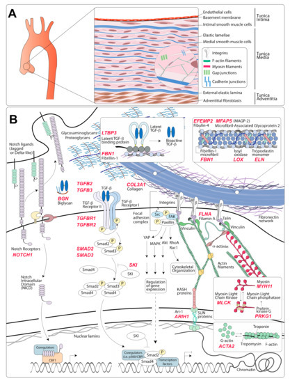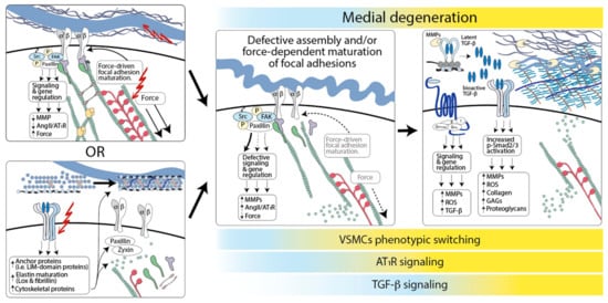 Mutations in components of signaling pathways that play a positive role in VSMC differentiation, such as TGF-β and Notch signaling, would initiate disease indirectly by interfering with the expression of components required for the assembly of functional focal adhesions. For example, TGF-β signaling controls the assembly of elastic fibers by regulating the expression of fibrillin-1, elastin, and lysyl oxidase; it also modulates the expression of proteins involved in focal adhesion and cytoskeletal rearrangement such as paxillin, Sm22 (Transgelin), and Lin11, Isl-1, and Mec-3 (LIM) domain-containing proteins CRP2 and zyxin [356,357,358,359,360,361,362,363,364,365]. Once lost, the opportunity to establish proper VSCM–ECM connections may be lost forever, given that adult VSMCs have a limited ability to elaborate and organize components of the elastic fibers [23,293]. As a result, once dilation or aneurysm is detectable, the activation of adaptive and maladaptive pathways in response to the original molecular defect would be ongoing.