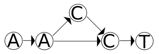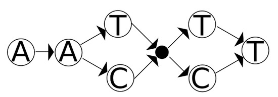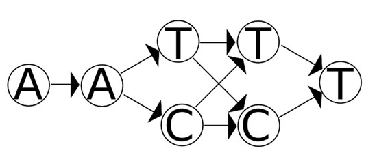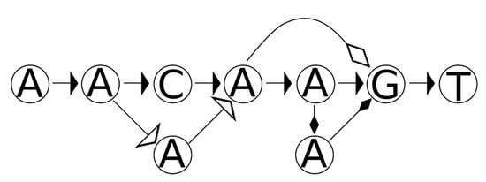 DNA sequences can be represented as DAGs (Figure 1). Taking a reference sequence as an example, consecutive letters in the reference can be thought of has having an implicit directed edge between nodes (nucleotides) (Figure 1). Sequence variation can also be encoded in DAGs, which can easily represent mismatches, insertions and deletions. Indeed, one of the trends in modern approaches to read mapping is to consider both the reference sequence and reference variation by mapping (aligning) reads from MPS to DAGs (when structural variants are not considered, e.g., [25,26]), while other approaches permit cycles, e.g., [27,28] (see also [29], which may apply well to STRs). In such approaches, a read is aligned to any path (consecutive nodes connected by directed edges) in the graph. Taken from a different perspective, the DAG can be thought of as a sequence or haplotype generator, wherein any path that begins at the first character and finishes at the last character (which, in practice, can be leading and sentinel values, e.g., the empty string) can be thought of as a feasible DNA sequence that matches the graph.