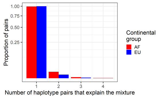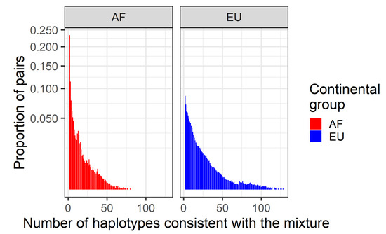 Another interpretation strategy is to consider the proportion of individuals that can be excluded from the mixture. From a graph perspective, a haplotype fails to be excluded if it can be traced in some path in the graph. From a variation perspective, this case generally corresponds to the following: that for all ambiguous sites, the haplotype in question has one of the two allele calls, and in the unambiguous cases, the haplotypes in the mixture and queried, agree. First principles would suggest that most haplotypes have some unique variant that would preclude artificial matches between some query and the mixture. As shown in Figure 10, the mode for both of the AF and EU groups is two, a finding that is consistent with the stated hypothesis. The mean (AF: 9.47, EU: 14.87) and median (AF: 6, EU: 10) number of haplotypes, however, suggest that while the most likely possibility is that some two-person mixture will be associated with only two haplotypes, it is also far more likely that more than two haplotypes will fail to be excluded. This finding is consistent with arguments of [35], which generally favor the more powerful likelihood-based interpretation strategies.