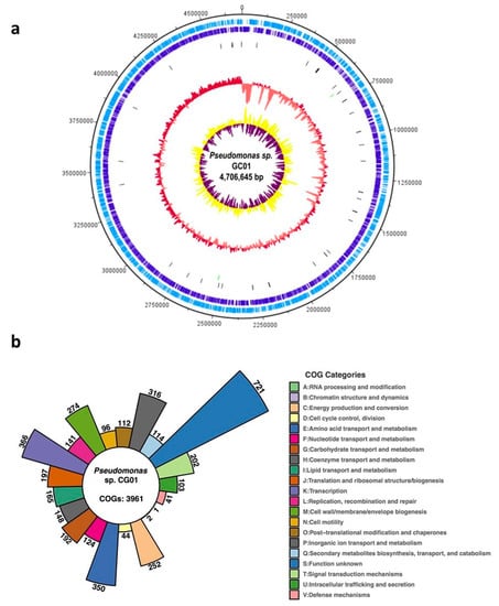 The draft genome sequence of Pseudomonas sp. GC01 was obtained by Illumina sequencing, and the assembly was deposited in GenBank (accession number JABEMH000000000.1). The size of the Pseudomonas sp. GC01 genome was 4,706,645 bp with a guanine-cytosine (GC) content of 58.6%. The genome annotation yielded 4875 predicted coding sequences (CDSs, including 2411 hypothetical proteins), 49 transference RNA (tRNA), and three ribosomal RNA (rRNA) genes on 2004 contigs (N50: 3572 bp; Figure 1a). The functional classification of the CDSs was performed based on clusters of orthologous groups of proteins (COGs) []. From the total number of CDSs (4875) found in Pseudomonas sp. GC01, 3961 (81.3%) of them were classified in COGs functional categories, of which 721 were functionally unknown (COG S) (Figure 1b), leaving 914 that could not be classified. The largest COG categories were transcription (COG K) with 366 CDSs, corresponding to 9.2% of the total, followed by amino acid transport and metabolism (COG E), inorganic ion transport (COG P) and metabolism, and cell wall/membrane/envelope biogenesis (COG M), with 8.8% (350 CDSs), 7.9% (316 CDSs), and 6.9% (274 CDSs), respectively (Figure 1b).