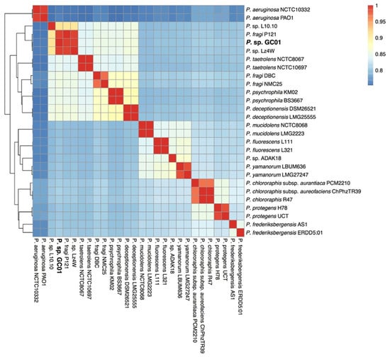 Genome similarity of the 28 Pseudomonas strains studied was determined by average nucleotide identity (ANI) analysis []. The ANI values ranged from 75.3% to 99.9%, indicating high diversity between the entire genomes set evaluated (Figure 2). A 99% sequence identity was determined between Pseudomonas sp. GC01, Pseudomonas sp. Lz4W [], and P. fragi P121 [], suggesting that these strains belong to the same species. However, it is interesting that the P. fragi P121 strain did not group with the other two P. fragi strains included in the dataset, only sharing 85% identity with both strains. Moreover, the Pseudomonas sp. GC01 also closely resembles Pseudomonas sp. L.10.10 [], with a 91% sequence identity, followed by an 85% sequence identity to P. fragi DBC [] and two strains of P. deceptionensis LMG25555 and DSM26521 [,]. Interestingly, the strains with the higher similarity to Pseudomonas sp. GC01 were isolated from cold environments, such as the Arctic (P. fragi P121 []) and Antarctica (Pseudomonas sp. Lz4W, Pseudomonas sp. L.10.10, and P. deceptionensis LMG25555; [,,]. The P. aeruginosa strains were also the most divergent and ancestral branch among the set.
