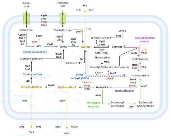 - Seiflein, T.A.; Lawrence, J.G. Methionine-to-Cysteine Recycling in Klebsiella aerogenes. J. Bacteriol. 2001, 183, 336–346. [Google Scholar] [CrossRef][Green Version]