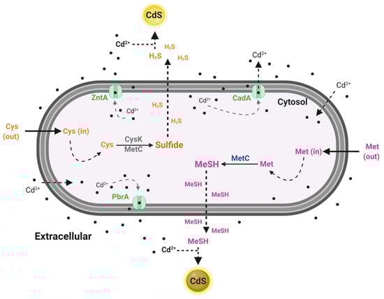 Sulfur is an essential element required for cell growth in all bacteria []. It is also a necessary component in CdS nanoparticle biosynthesis [,,,]. The Pseudomonas sp. GC01 strain can use several sulfur sources, such as sulfate, sulfite, thiosulfate, Cys, and Met, to grow and biosynthesize CdS QDs []. However, the extracellular biosynthesis mechanism of the CdS nanoparticles has been linked to the ability of this strain to release H2S and MeSH in the presence of Cys and Met, respectively [].