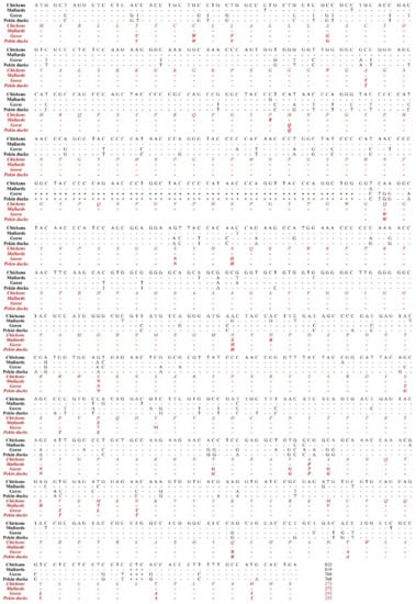 The comparison of the ORF of the PRNP gene was performed in chickens, mallards, geese, and Pekin ducks. The black text indicates nucleotide sequences and the red and italic texts indicate amino acid sequences. -, identical nucleotide or amino acid to chicken; *, nucleotide deletion; $, stop codon.