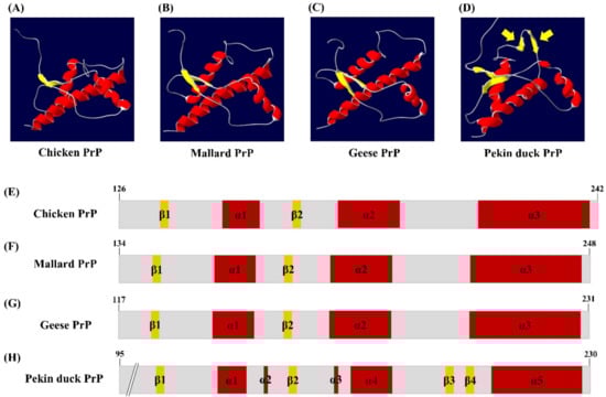 The tertiary and secondary structure of avian prion proteins (PrPs). The diagram of the tertiary structure model and schematic representation of the secondary structure of avian PrPs was constructed by SWISS-MODEL and Swiss PDB Viewer. (A) The tertiary structure of the chicken PrP. (B) The tertiary structure of the mallard PrP. (C) The tertiary structure of the goose PrP. (D) The tertiary structure of the Pekin duck PrP. The yellow arrows indicate additional β-sheet structures. (E) The secondary structure of the chicken PrP. (F) The secondary structure of the mallard PrP. (G) The secondary structure of the goose PrP. (H) The secondary structure of the Pekin duck PrP. The colors highlight α-helices (red), β-sheets (yellow) and coils (gray).