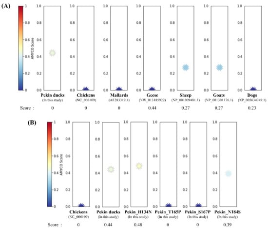 Prediction of the aggregation propensities in avian prion proteins (PrPs). (A) The aggregation propensities into amyloid structures in the PrPs were predicted by AMYCO. The text in parentheses indicates protein IDs of the reference sequences used for AMYCO analyses. (B) The aggregation propensities according to the substitution with chicken-specific amino acids in the Pekin duck PrP using AMYCO. Pekin_H134N indicates the AMYCO result according to the substitution of His at codon 134 to Asn in the Pekin duck PrP. Pekin_T165P indicates the AMYCO result according to the substitution of Thr at codon 165 to Pro in the Pekin duck PrP. Pekin_S167P indicates the AMYCO result according to the substitution of Ser at codon 167 to Pro in the Pekin duck PrP. Pekin_N184S indicates the AMYCO result according to the substitution of Asn at codon 184 to Ser in the Pekin duck PrP.