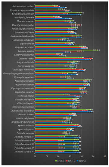 The HRM curve genetic assay could differentiate the DNA of species since each peak represented a unique amplicon from a specific species. This assay was performed to investigate whether a variation in the ITS region of different species was discriminative in derivative and normalized melting curves. The HRM profiles of the ITS, ITS1, and ITS2 amplicons of all 36 species are shown in Supplementary Materials Figures S1–S3, and the observed melting temperatures (Tm) are summarized in Figure 1. The Tm values for fragments ITS, ITS1, and ITS2 of Psilocybe cubensis were 83.72 ± 0.01, 80.98 ± 0.06, and 83.46 ± 0.08 °C, respectively. Based on a combination of three Tm values and melting peaks, Psilocybe cubensis could be easily distinguished from the other species. Some species also presented species-specific Tm values, which are summarized in Table 2. Apparent discrepancies were also observed between some genetically close species, such as Psilocybe cubensis (ITS, Tm: 83.72 °C) and Psilocybe merdaria (ITS, Tm: 82.35 °C), as well as Panaeolus antillarum (ITS, Tm: 82.95 °C) and Panaeolus papilionaceus (ITS, Tm: 83.17 °C).
