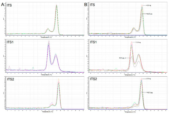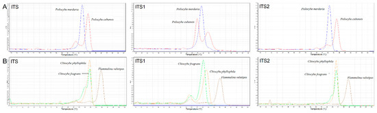 Specificity of ITS, ITS1, and ITS2 regions between genetically close species (A): Psilocybe cubensis and Psilocybe merdaria; (B): Clitocybe fragrans, Clitocybe phyllophia and Flammulina velutipes). The negative first derivative (−dF/dT) of the normalization melt curve from HRM.