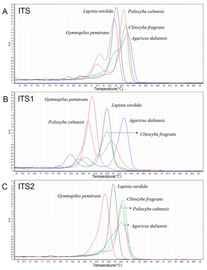 Some genetically close species or far-related species were selected to evaluate the specificity of the three ITS amplicons. As shown in Figure 2A, there are significant discrepancies in the HRM melting curves between two species from the genus Psilocybe. Although similar melt peaks of Clitocybe fragrans and Clitocybe phyllophila were detected in the ITS and ITS2 melt charts, they could still be discriminated against by ITS1 (Figure 2B). In addition, the HRM curve peaks of Flammulina velutipes were significantly different from Clitocybe fragrans and Clitocybe phyllophila even though they belonged to the same Tricholomataceae family. Finally, five species from different families were selected in Figure 3 to show the divergences between far-related species. Significant differences in HRM peaks were observed among almost all five species. Although the melt curves of some species were clustered together in one of the three melt charts, they could be distinguished in the other two charts. The results presented here demonstrated that the ITS HRM assay could be utilized to distinguish mushroom species. However, there were still many species that overlapped with Tm values even if based on a combination of the three ITS regions. For these species, our ITS HRM assay could only serve as a preliminary experiment before accurate species identification using ITS sequencing.