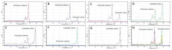 Variation in the HRM profile of the ITS region. The negative first derivative (−dF/dT) of the normalization melt curve of rDNA ITS from HRM. Mixtures includes different contents of Psilocybe cubensis and Cannabis sativa: (A) 100/0%, (B) 90/10%, (C) 70/30%, (D) 50/50%, (E) 30/70%, (F) 10/90%, (G) 0/100%, and (H) is a summary of all situations.