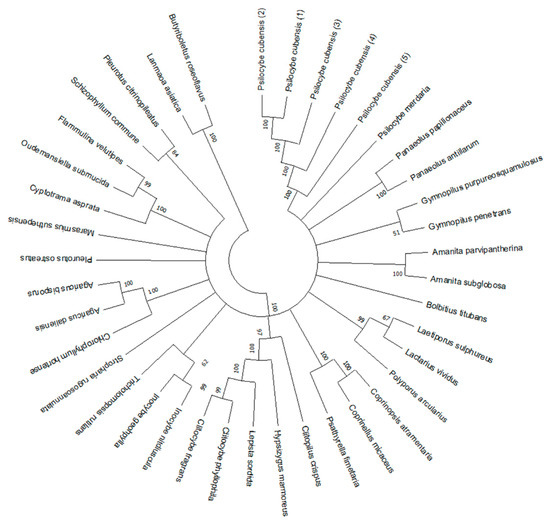 Based on the output of ITS sequencing, the nucleotide sequences were aligned using MEGA-X software, and 92.19% of the sequence within the ITS regions was observed to be variable between 36 kinds of mushrooms, which showed high polymorphism. Then, a phylogenic tree was constructed utilizing the neighbor-joining distance algorithm for the ITS region. The bootstrap consensus tree inferred from 1000 replicates was taken to represent the evolutionary history of the taxa analyzed and values greater than 50% were indicated on the branches. As is shown in Figure 6, the phylogenic tree generated by ITS sequences separated different species into different branches, which clearly identified the differences in ITS sequences between species. The two species from the genus Clitocybe were gathered into the same terminal branches, while Psilocybe cubensis and Psilocybe merdaria were in separate branches, which was consistent with our HRM data shown in Figure 2. Although Flammulina velutipes belonged to the same family as the two Clitocybe species, they showed genetic distances in our phylogenic tree, which interpreted the divergences in the HRM curves between these three species. Furthermore, as expected, the five species from different families in Figure 3 were mostly separated into different branches, except Lepista sordida and Clitocybe fragrans that showed relatively close genetic distances. Our phylogenic tree further supported the HRM data presented above and verified the reliability of our study.