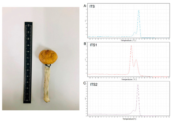 The genomic DNA of the suspected sample was extracted successfully and diluted to 1.0 ng/µL. In the HRM analysis, the results showed that the Tm values of the sample’s ITS, ITS1, and ITS2 were 83.88 ± 0.12, 81.03 ± 0.08, and 83.44 ± 0.05 °C, which perfectly matched the HRM curves and Tm values of Psilocybe cubensis in our research (Figure 7). In addition, the sequencing results also matched to Psilocybe cubensis (KU640170, 99.71%). This suspected sample was therefore identified as Psilocybe cubensis.