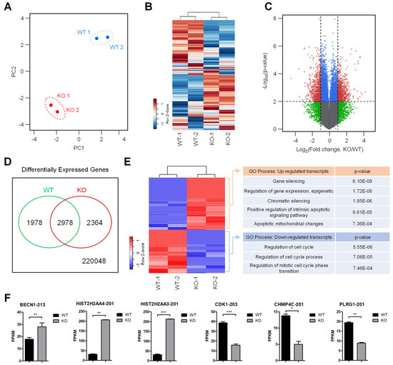 To investigate whether SMUG1 modulates cell proliferation and apoptosis through the regulation of gene expression, RNA-seq analysis was performed using WT and SMUG1 KO HepG2 cells. Total RNA was extracted from cells, and sequencing libraries were generated from two independent samples. After filtering the RNA-seq data (FPKM > 1, at least in one group), a comprehensive list of 24,444 transcripts was obtained (Table S1). Principal component analysis using DESeq revealed transcriptomic dynamics in each biological group (Figure 8A). Application of DESeq with a conservative approach to the RNA-seq data obtained from the WT and KO cells identified 1029 differentially expressed (DE) transcripts (RNA-seq FPKM values having ≥ 2 fold change, ≤0.01 false discovery ratio (FDR)). Overall expression patterns of transcripts were shown by the heat maps between WT and KO groups. Unsupervised hierarchical clustering analysis, based on Pearson’s correlation of averaged and log2 of normalized FPKM values of WT and KO groups, showed a decisive shift in the form of upregulated and downregulated transcripts (Figure 8B). All 1029 DE transcripts (502 upregulated and 527 downregulated transcripts) in SMUG1 KO groups are listed in Table S2. Compared with the control, the volcano plots were constructed by integrating both the FDR and fold change of each transcript (FDR ≤ 0.01 and absolute log2 (fold change) ≥ 1), to reveal the general scattering of the transcripts and to filter the differentially expressed transcripts in the KO group (Figure 8C). A Venn diagram showed the number of DE transcripts in KO groups (Figure 8D), and hierarchical clustering analysis showed clear changes in the form of upregulated and downregulated transcripts from DE transcripts (Figure 8E).