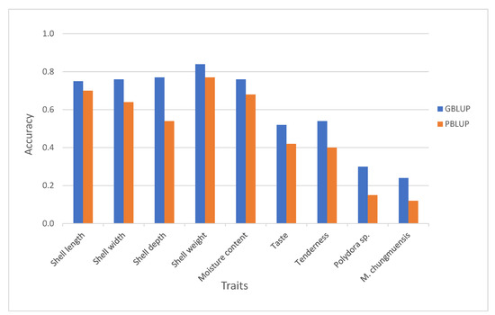The prediction accuracy using the genomic information (G-matrix) for the nine traits studied were higher than that obtained using the Best Linear Unbiased Prediction using pedigree information (A matrix, PBLUP) (Figure 1, Table 3), with an increase of 15% in shell length (0.65 PBLUP to 0.75 GBLUP) to 200% for Marteilioides chungmuensis (0.12 PBLUP to 0.24 GBLUP) and for Polydora sp. (0.15 PBLUP to 0.30 GBLUP). Our study is in agreement with previous reports that indicate breeding value prediction accuracy to be higher using genomic information than pedigree relationships in aquaculture species [15,16,22,23,50,51,52,53,54,55,56]. The results of this study highlight the potential of genomic selection for economic traits in oysters. However, the genotyping cost remains a challenge for most aquaculture selective breeding programs. Therefore, a suitable strategy for covering genotyping costs must be devised to enable a wider adoption of genomic selection in the aquaculture industry.