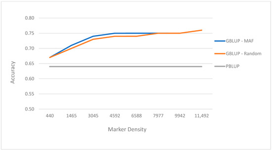 Two strategies to assess the effects of marker density on the accuracies of genomic prediction were used gBLUP method. First, the density of the SNP panel used to build the genomic relationship matrix was changed by progressively increasing the minor allele frequency (MAF) threshold from 0.01 (almost all SNPs) to 0.475 (very few SNPs with balanced allele frequencies), resulting in progressively fewer markers being used. For the second strategy, the SNP panel members were randomly selected from the full dataset with three replicates for each panel size.