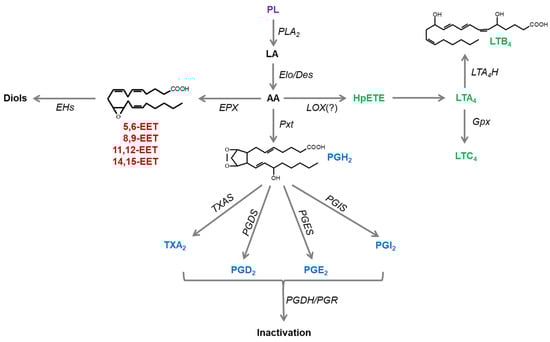 Eicosanoid biosynthesis and degradation in insects. Phospholipase A2 (PLA2) catalyzes hydrolysis of linoleic acid (LA) from membrane-associated phospholipids (PLs), which is elongated by long-chain fatty acid elongase (Elo) and desaturated by desaturase (Des) to arachidonic acid (AA). AA is then oxygenated by epoxidase (EPX) into epoxyeicosatrienoic acid (EET), lipoxygenase (LOX) into leukotriene (LT), or cyclooxygenase-like peroxynectin (Pxt) to prostaglandin (PG). EETs are degraded by soluble epoxide hydrolase (sEH). LTA4 is formed from 5-hydroxyperoxide eicosatetraenoic acid (HpETE) and changed into LTB4 by LTA4 hydrolase (LTA4H) or into LTC4 by glutathione peroxidase (Gpx). Various PGs are formed from PGH2 by cell-specific enzymes, thromboxane A2 (TXA2) synthase (TXAS), PGD2 synthase (PGDS), PGE2 synthase (PGES) and PGI2 synthase (PGIS). These PGs are degraded by PG dehydrogenase (PGDH) and PG reductase (PGR).