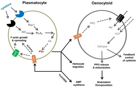 Prostaglandins (PGs) mediate cellular and humoral immune responses through specific receptors (PGRs). PGs are synthesized from arachidonic acid (AA), which is released from phospholipids by phospholipase A2 (PLA2) and is activated by immune challenge via cytokines or nitric oxide (NO). Oenocytoid cell lysis is mediated by PGR through a PKC pathway to activate a sodium-potassium-chloride cotransporter (NKCC), which generates an osmotic gradient that pulls water into the cell. Prophenoloxidae (PPO) is released from oenocytoid into hemolymph, where it is activated to phenoloxidase, which leads to melanin formation. In plasmatocyte, PGR activates cytoskeletal rearrangement via a small G protein Cdc42 and change cell volume via aquaporin (AQP) for hemocyte-spreading behavior. PGs also mediate antimicrobial peptide (AMP) synthesis via Toll/IMD immune signaling components.
