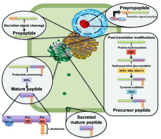 PSY1 was isolated from Arabidopsis cell culture medium and identified as an 18-amino-acid residue carrying three post-translational modifications in its active domain; one sulfated tyrosine and two hydroxylated proline residues, one of which is also glycosylated with three L-arabinose units [5]. These modifications are all catalyzed by processing enzymes in the secretory pathway. Figure 1 presents the proposed synthetic pathway of PSY peptides from expression in the nucleus to secretion into the apoplast, and suggests enzymes involved in processing to reveal the mature, active peptide.