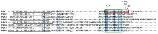 Alignment of the PSY1 precursor peptide and its seven homologs in Arabidopsis. Letters in bold and shades of blue indicate conservation between amino acids with weakly similar properties, amino acids with strongly similar properties, and complete conservation, respectively. Green box highlights the conserved PSY domain and red box emphasizes the mature, active PSY1 peptide with indicated modifications. Predicted secretion signal peptide is underlined. PSY5 is found in four splice variants, of which the shortest is presented in the figure.