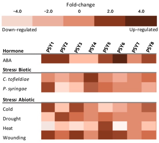 The in silico analysis of PSY1-8 gene expression was additionally extended to investigate whether the PSY homologs are involved in plant responses to different stresses. Seven of the eight PSYs showed substantial changes in transcript levels upon various treatments, indicating that they are regulated at the transcriptional level (Figure 6). Only PSY7 was not affected by any perturbations. PSY1, PSY2, PSY5, PSY8 and in particular PSY6 were upregulated in response to abscisic acid (ABA). PSY3 and PSY4 were downregulated. As part of an immune response to pathogens, PSY1 was previously shown to be part of a mechanism downregulating the salicylic acid response, which unregulated would have left the plant more vulnerable [34]. The PSY homologs may function in a similar mechanism to regulate ABA signaling. ABA is involved in a variety of environmental stress responses, including both biotic and abiotic stresses [58]. Particularly abiotic stress responses activate the ABA signaling pathway, though a correlation between PSYs being upregulated by both ABA and abiotic stresses is not observed in Figure 6. In general, the seven PSYs that are affected by the different perturbations, have very diverging responses to the tested abiotic stresses (Figure 6). These very differential responses to external factors indicate that the different PSYs are involved as signaling molecules for different conditions in the plant.