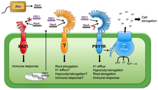 In order to successfully infect plants, pathogens have found clever ways to gain evolutionary advantages. The bacterial pathogen Xoo produces a molecule, RaxX, which greatly mimics the active peptide sequence of the PSY homologs [33]. Pruitt et al. (2017) found that RaxX also mimics the growth promoting activities of PSY peptides by promoting root growth. Treating psy1r mutants with RaxX or PSY1 increased root growth in a similar manner. These findings indicate that PSY1R is not the receptor for RaxX and suggests that PSY1 has another, unidentified receptor functioning in promoting root growth. This putative receptor is hypothesized to require its substrates to have the amino acid sequence conserved between the PSY1 and the RaxX pathogenic molecule, thus also being a possible receptor for the rest of the PSY peptide family (Figure 2 and Figure 7). Here PSY3, PSY4, and PSY6 seemingly functioning in root growth, are likely also to be ligands for this receptor. Furthermore, it was found that the rice XA21 immune receptor was able to recognize RaxX but not PSY1 [33,35]. RaxX could only interact with XA21 when carrying its C-terminal domain of three amino acids, PPR, though binding was independent of its five-amino-acid N-terminal domain, emphasizing the high specificity of the receptors for their peptide ligands [33]. The model presented in Figure 7 shows the receptor for PSY1, PSY1R, known to phosphorylate and thus activate the PM H+-ATPase, thereby promoting elongation of cells. PSY1 is so far the only ligand identified for PSY1R, however, no binding studies have been made and it is not known how much of the mature peptide is needed for PSY1R perception. If the C-terminal part of PSY1 is not important for interaction with PSY1R, other PSY homologs may also be involved in this signaling pathway. The hypothesized receptor which is activated by both RaxX and PSY1, and thus possibly also other PSY1 homologs, may function in a mechanism similar to that of PSY1R in order to induce root elongation.