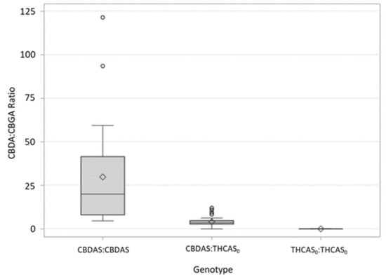 Distribution of CBDA:CBGA ratios in Cross TE, a backcrossed F2 population of 102 individuals resulting from an F1 cross between a Type III (CBDA-dominant) plant and a Type IV (CBGA-dominant) C. sativa plant. The arithmetic mean is indicated with a diamond. Whiskers indicate 1.5 × the inner quartile range and open circles are observations that fall outside of this parameter.