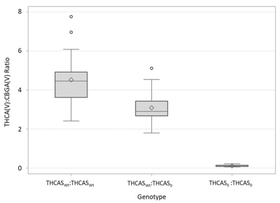 Distribution of THCA(V):CBGA(V) ratios in Cross FH, a selfed F2 population of 99 individuals resulting from an F1 cross between a Type I (THCA(V)-dominant) plant and a Type IV (CBGA-dominant) C. sativa plant. The arithmetic mean is indicated with a diamond. Whiskers indicate 1.5 × the inner quartile range and open circles are observations that fall outside of this parameter.