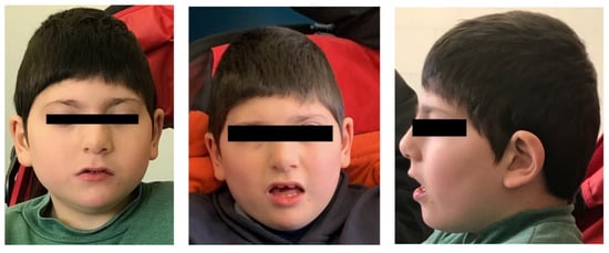 At last clinical evaluation, performed at 9 years old, he showed distinctive facial features including bitemporal narrowing, left posterior plagiocephaly, low anterior hairline, synophrys, strabismus, prominent nasal bridge, underdeveloped nasal alae, malar flattening, narrow palate, and slight anteverted ears (Figure 1). Examination of the oral cavity, limbs, extremities, skin and external genitalia was normal. Language was absent: he vocalized, but without communication purposes.