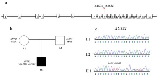 - Jolley, A.; Corbett, M.; McGregor, L.; Waters, W.; Brown, S.; Nicholl, J.; Yu, S. De novo intragenic deletion of the autism susceptibility candidate 2 (AUTS2) gene in a patient with developmental delay: A case report and literature review. Am. J. Med. Genet. A 2013, 161, 1508–1512. [Google Scholar] [CrossRef] [PubMed]